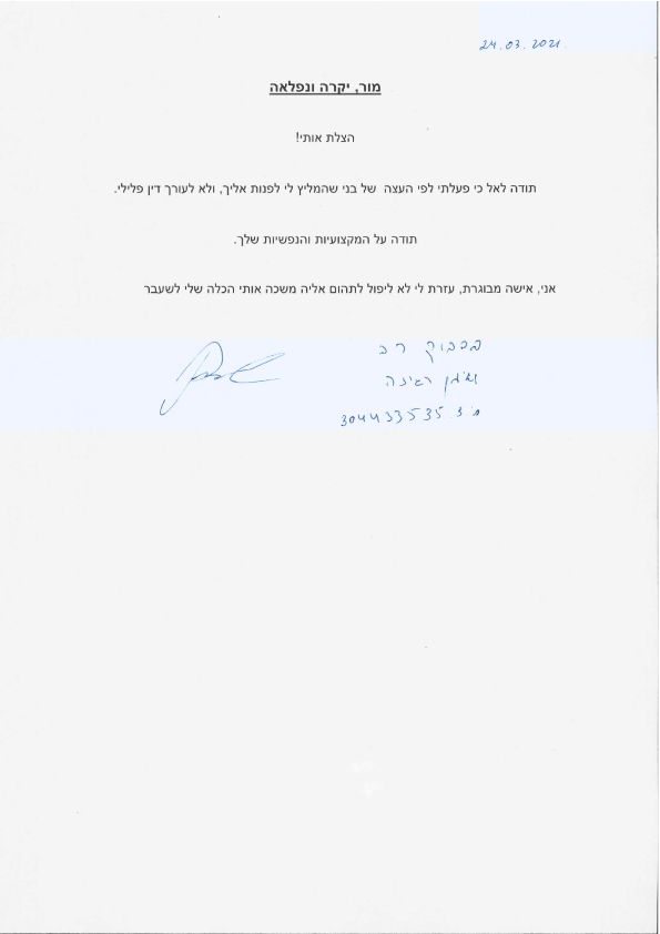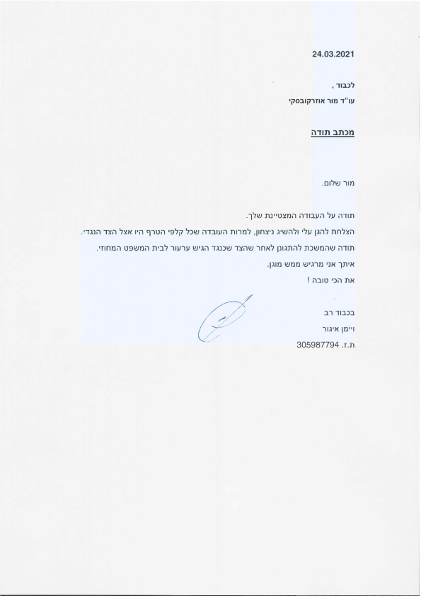 ברצוננו להביע תודה והערכה רבה על טיפולך המסור והמקצועי בתיק הסבוך שהבאנו לפתחך בזמן קצר יחסית.