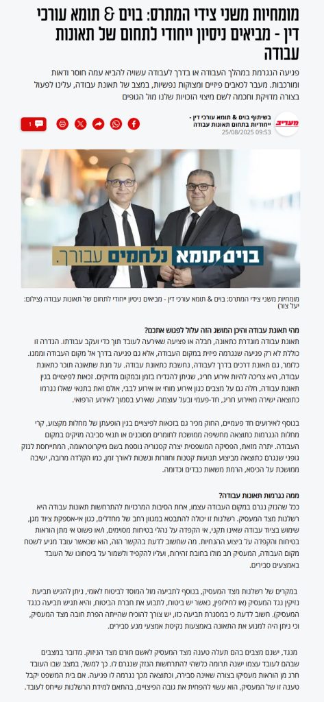 דף הבית » מן התקשורת » מומחיות משני צידי המתרס: בוים & תומא עורכי דין – מביאים ניסיון ייחודי לתחום של תאונות עבודה